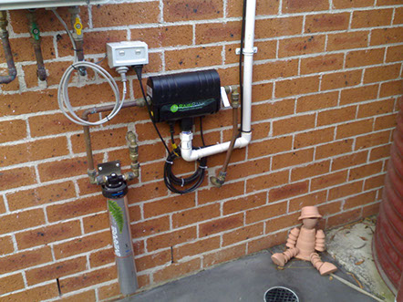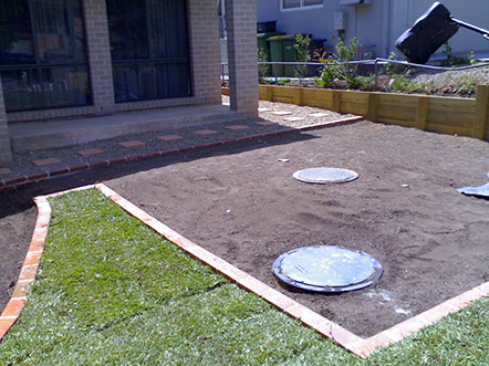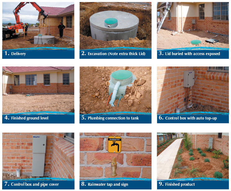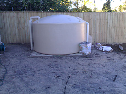 Below is a typical installation of a typical underground raintank, which relies on a gravity system to feed the tank from the downpipes.