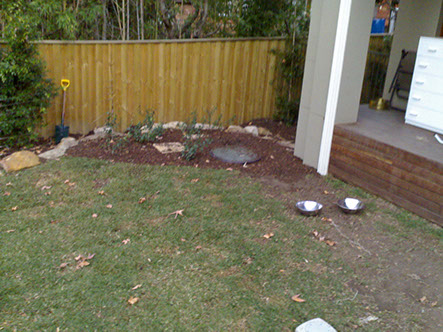 Above is two 10,000L Rainmaster tanks in the front yard, with landscaping yet to be completed around the tanks.