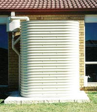 The image above shows a typical rainwater tank only collecting part of a roof. The down-pipe connects directly to the top of the tank. This is the most ideal installation. However, due to the Basix Tool penalizing collection of only part of a roof, most clients choose the entire roof area to drain to the tanks, other wise the tank size is increased in size to sometimes volumes that must be put underground.