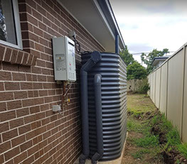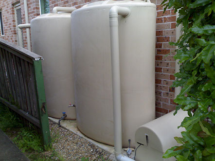 Typical Twin 2100L rainwater tanks by Nylex. Pump Unit in concealed box adjacent tanks. They are not always included in a tank package. Be sure to ask if you prefer the pumps covered. Minimum setback to boundaries is 450mm under State Government Requirements.